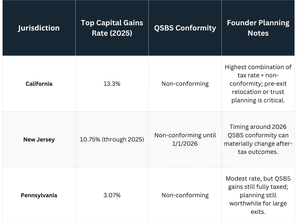 - New Jersey founders: Must consider timing strategies around 2026 QSBS conformity—crossing that date can materially shift after-tax outcomes.